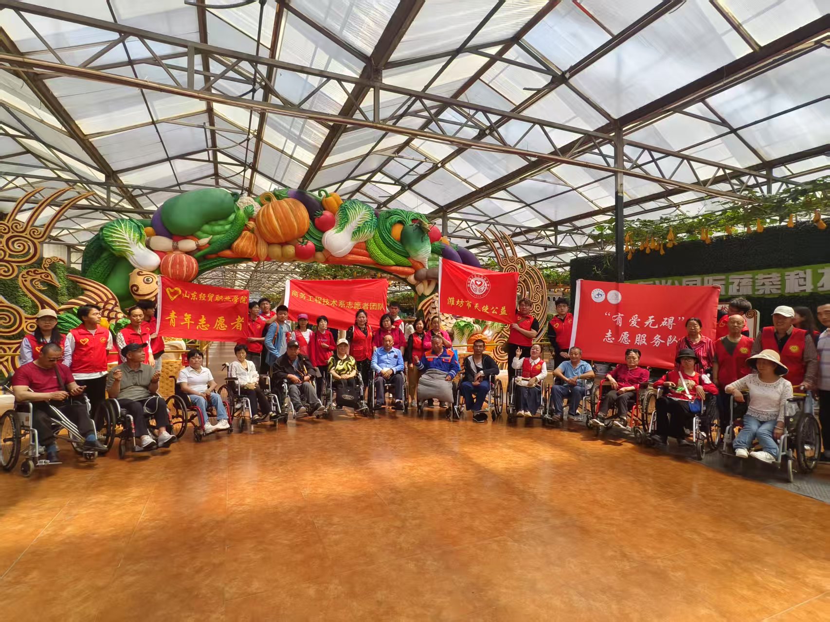 在第35个“全国助残日”来临之际,在中国竞彩网团委的组织下,国际商务系“有爱无碍”志愿服务队与商务工程系志愿者团队助力潍坊天使公益基金联合开展“有爱无碍-2025全国助残日寿光菜博会大型助残出游”活动,帮助25名残障人士无障碍游览寿光蔬菜博览园,以实际行动践行“奉献、友爱、互助、进步”的志愿服务精神。?