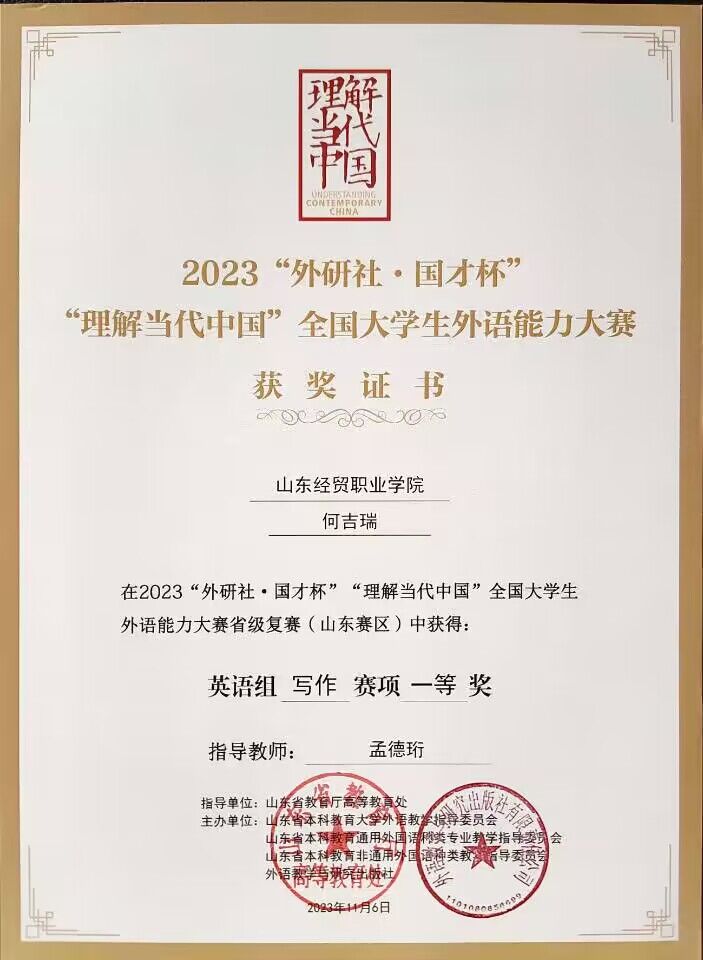 23级学生荣获“外研社·国才杯”“ 理解当代中国”全国大学生外语能力大赛省级复赛(山东赛区) 英语组写作赛项一等奖。