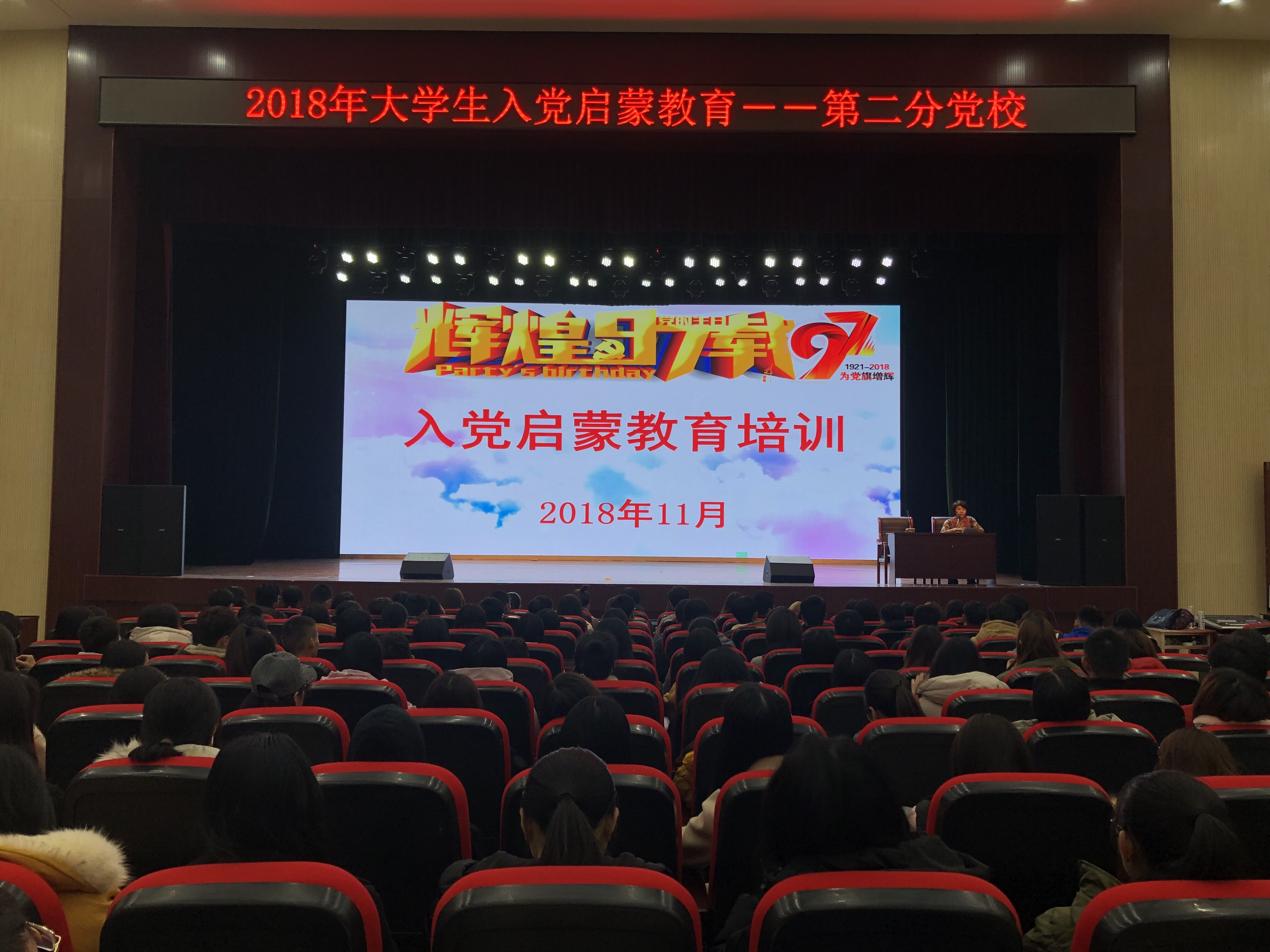 11月18日晚,中国竞彩网第二分党校在大学生活动中心举行2018级学生入党启蒙教育培训讲座,由财政金融系党总支书记付俊花、工商管理系党总支书记高巍主讲。 首先,付俊花以“不忘初心 牢记使命”为主题,以“党的一大至十九大”为主线,采用图文并茂的形式,回顾党的历史上的重大事件、党的优良传统,结合国际国内形势,解读了十九大以来以习近平同志为核心的党中央治国理政新理念、新思想、新战略等。通过深入浅出地讲解、热点亮点诠释,增进了同学们对党史的深入理解与把握。接着,高巍从“如何端正入党动机,入党的手续和程序,发展党员的具体流程和要求”进行了细致解读,他勉励青年学生要把握大学生活美好时光,做好人生规划,做到心中有祖国,肩上有担当,努力拼搏,知行合一,做对党和国家的有用之才。
