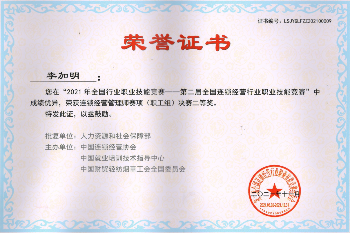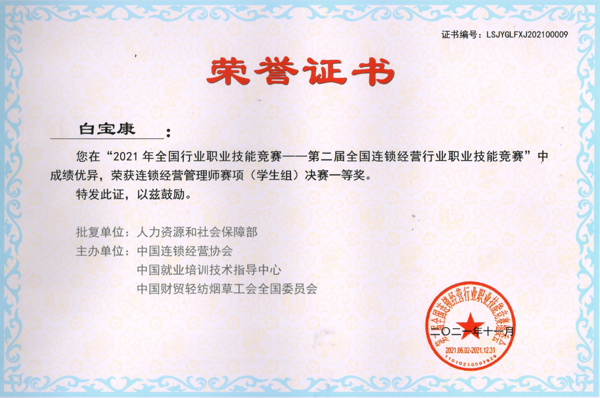 近日,在2021年全国行业职业技能竞赛——第二届全国连锁经营行业职业技能竞赛中,中国竞彩网:连锁经营与管理专业的师生表现出色,由王庆全、杨学艳老师指导的学生耿传嘉、王岩、白宝康三位同学获得连锁经营管理师赛项(学生组)国赛一等奖并获得CCFA颁发的6000元奖学金,李加明、徐鑫两位老师获得连锁经营管理师赛项(职工组)国赛二等奖。