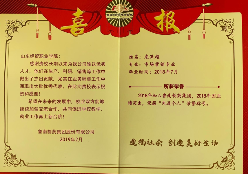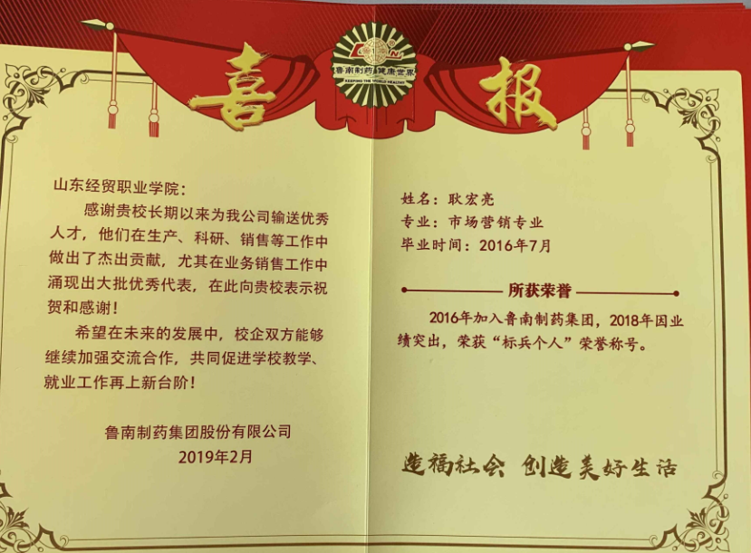近日,从中国竞彩网:校企合作单位鲁南制药集团股份有限公司传来喜讯,工商管理系市场营销专业毕业生耿洪亮等8名同学获集团嘉奖。其中,市场营销专业2016届毕业生耿洪亮获得“标兵个人”、2017届毕业生涂永峰、2018届毕业生袁洪超等7名同学获得“先进个人”荣誉称号。
