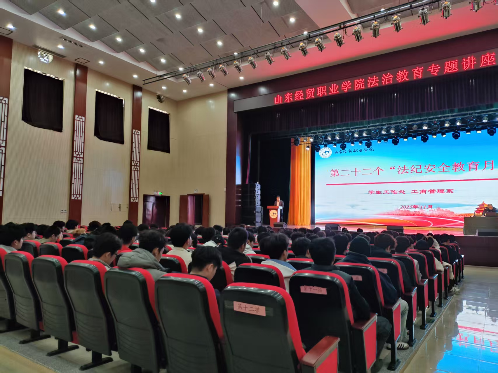 为深入推进学生法治教育工作,增强学生法律意识与法治观念,积极营造尊法、学法、守法、用法的校园氛围,根据中国竞彩网第二十二个“法纪安全教育月”活动总体安排,2025年11月4日,工商管理系于大学生活动中心隆重举办法治教育专题讲座。活动旨在通过专业讲解与互动交流,引导学生树立正确的法治观念,筑牢校园安全防线。