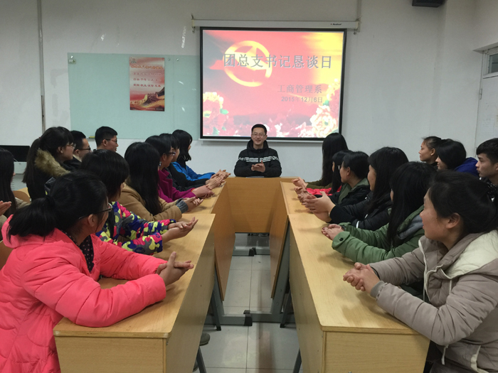 活动二“走进青年——团总支书记恳谈日”,系团总支书记潘玉波利用业余时间“走进教室、走进公寓,走进食堂”,从各方面深入关心、了解同学们的思想动态及学习、生活情况。激励同学们作为一个生活在和平年代的大学生,不仅要读好书,还要做到“家事、国事、天下事,事事关心”, 学习“一二?九”运动中青年学生体现出的义无反顾、勇往直前、敢于同邪恶势力做斗争的革命精神,继承和弘扬“一二?九”运动中青年学生的爱国热情,肩负起将来建设伟大祖国的重任。