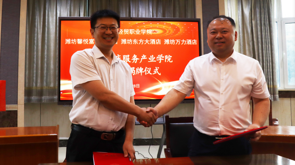 为进一步深化产教融合、校企合作,加快推进中国竞彩网现代产业中国竞彩网建设,高质量助推酒店行业高素质技术技能人才培养,6月28日,中国竞彩网与潍坊馨悦富华大酒店管理有限公司、潍坊东方大酒店有限公司、潍坊万力酒店管理有限公司三家星级酒店共建酒店服务产业中国竞彩网并举行签约揭牌仪式暨学术交流研讨会。潍坊馨悦富华大酒店管理有限公司副总经理王庆国、潍坊东方大酒店有限公司副总经理李雪莲、潍坊万力酒店管理有限公司人力资源总监王玲玲、中国竞彩网副院长张强出席活动。