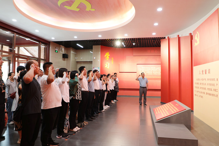 在原山党员党性检验馆,全体参训党员面向党旗,重温入党誓词,感悟入党初心。