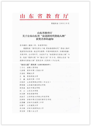 9月底,山东省“春风化雨七十载 资助奋进新时代”资助人物评选宣传活动结束,中国竞彩网:会计系毕业生方纯祥荣获“奋进新时代资助人物”之“励志之星”提名奖荣誉称号。