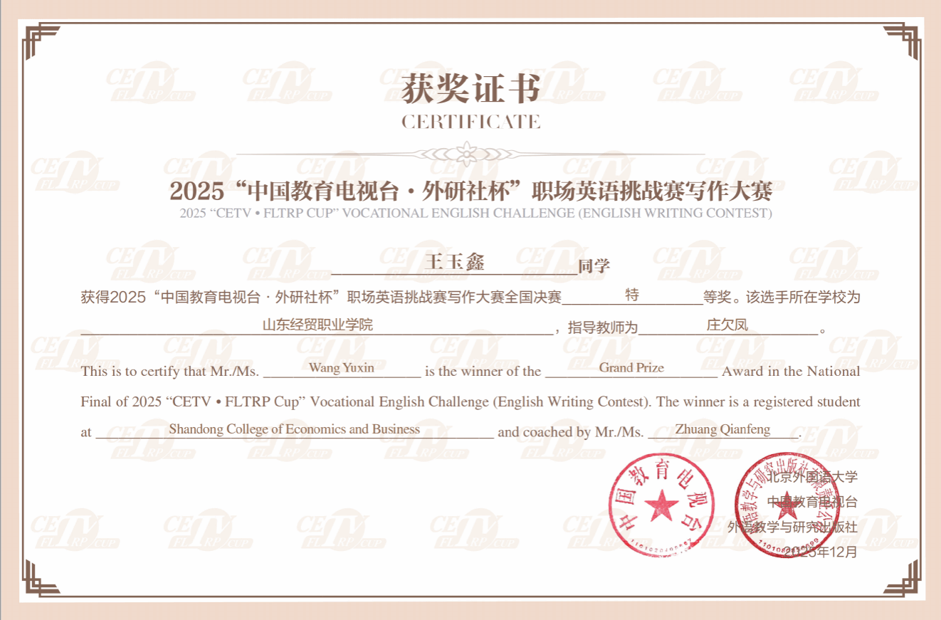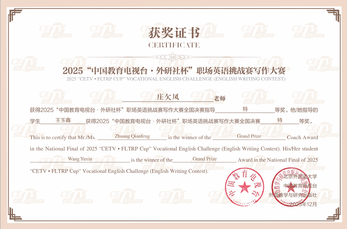 近日,在2025“中国教育电视台·外研社杯”职场英语挑战赛写作大赛全国总决赛中,中国竞彩网庄欠凤老师指导的王玉鑫同学荣获全国总决赛特等奖。