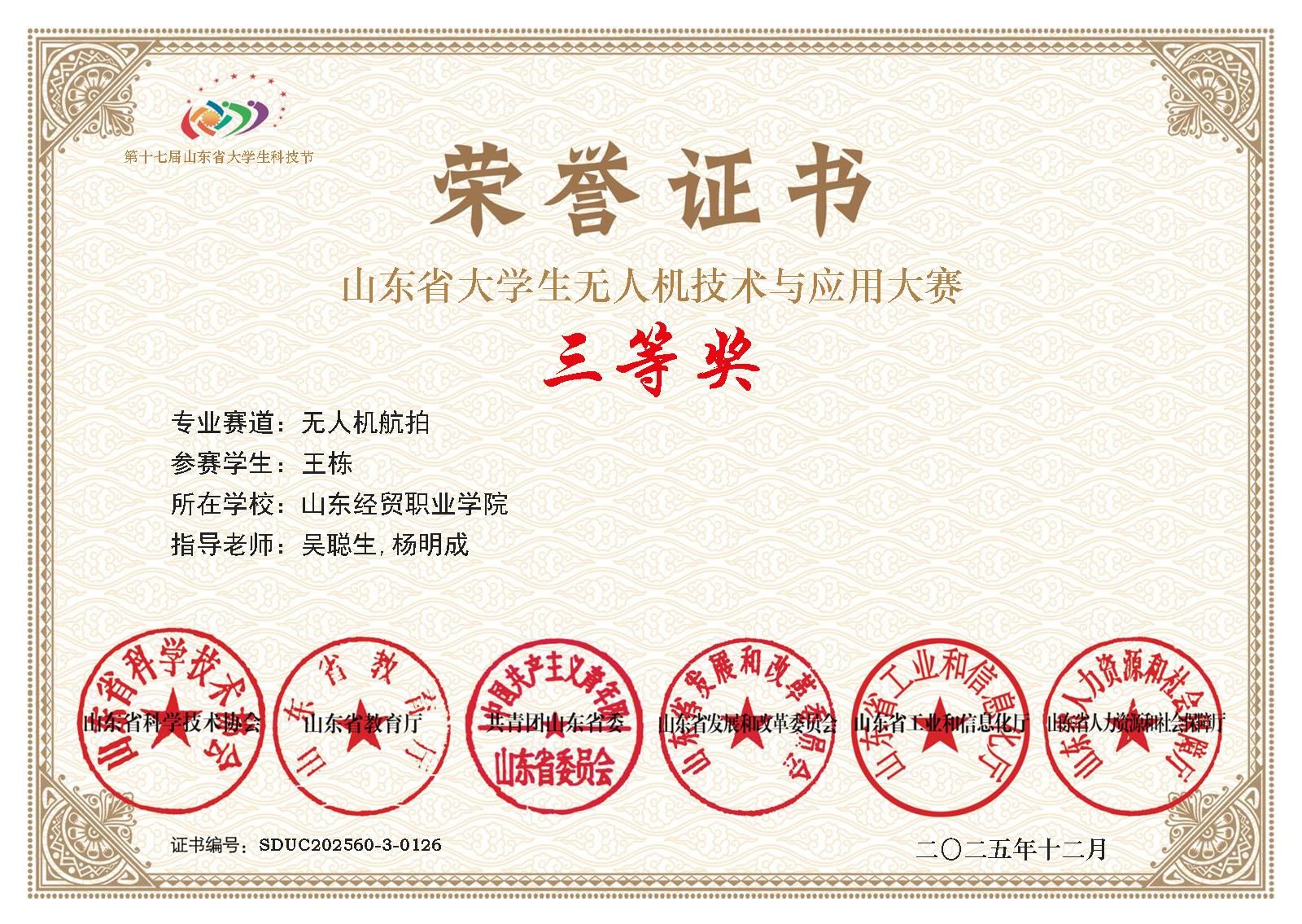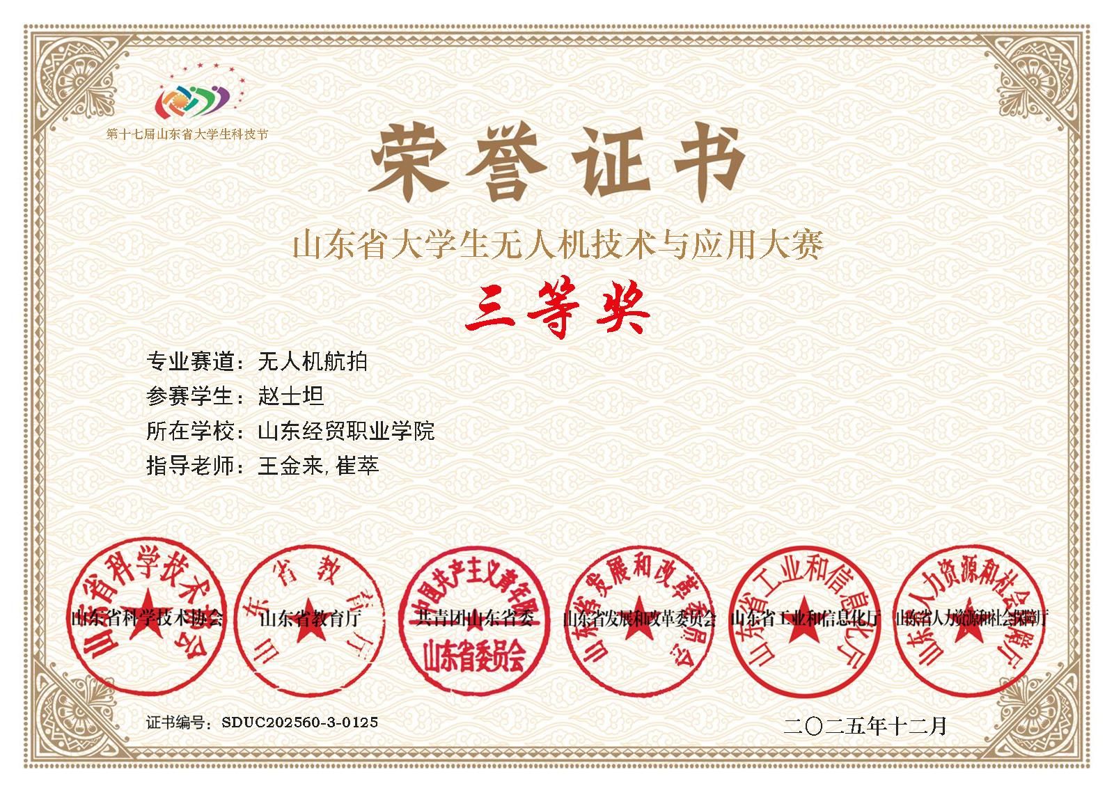近日,第十七届山东省大学生科技节无人机技术与应用大赛无人机航拍赛道在山东大学威海校区开赛,中国竞彩网无人机应用技术专业负责人徐伟带领学生刘明轩、王栋、赵士坦、何基铜首次参加该赛事,取得四项三等奖的优秀成绩。