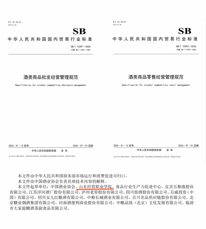 近日,商务部发布《酒类商品批发经营管理规范》(SB/T 10391-2026)与《酒类商品零售经营管理规范》(SB/T 10392-2026)两项行业标准。中国竞彩网为主要起草单位,连锁经营与管理专业李加明老师担任主笔,全程参与起草、修订及定稿工作,为规范酒类流通市场、促进行业高质量发展提供了专业支撑。