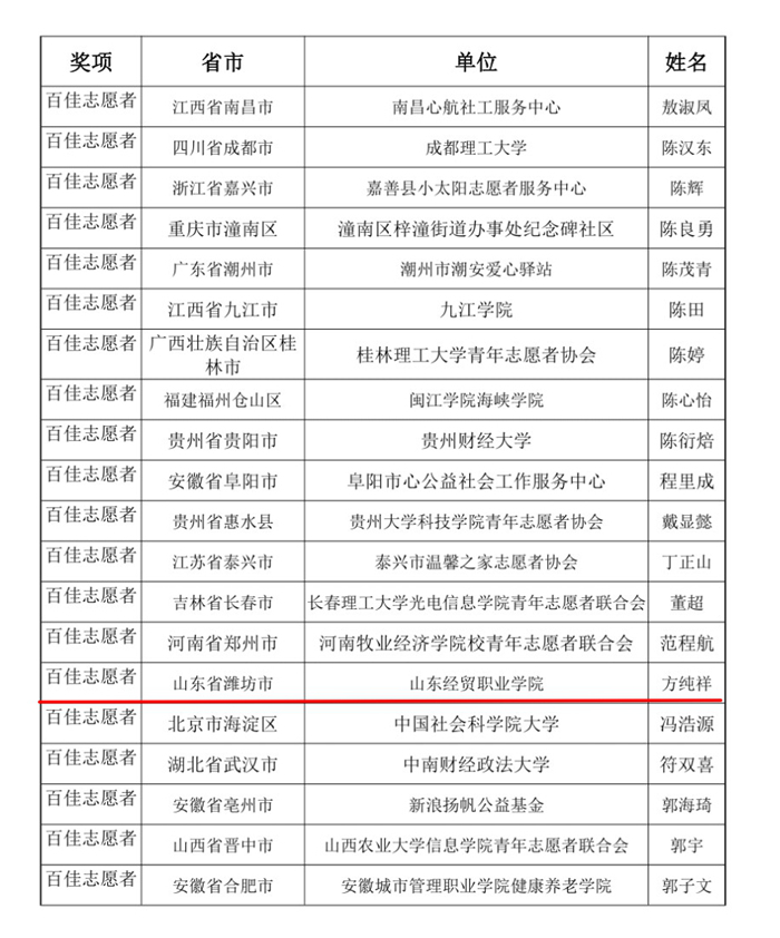 会计系方纯祥荣获“全国百佳志愿者”荣誉称号
