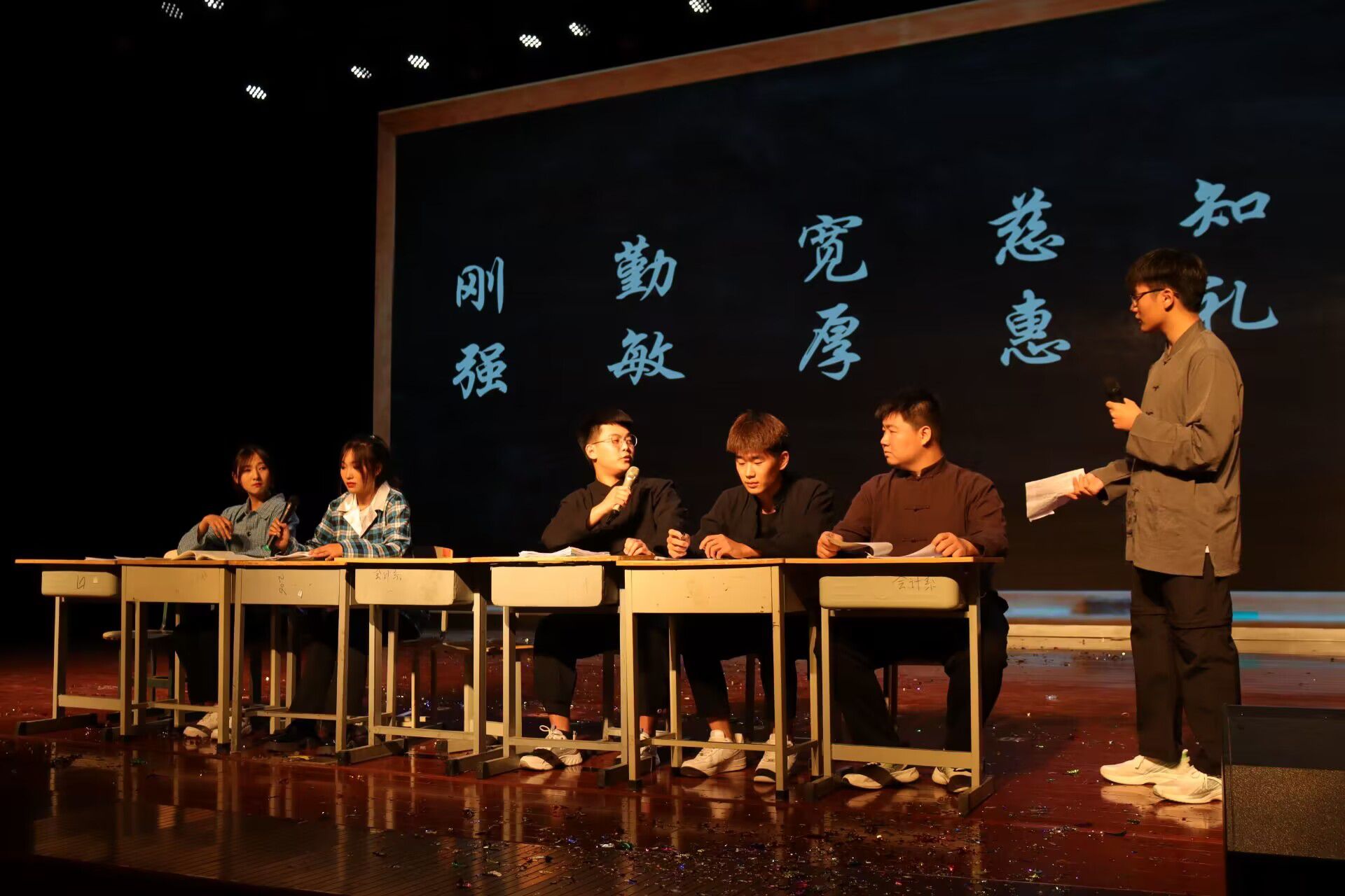 健美操《奔跑的青春》以优美的舞姿拉开了晚会的序幕。武术表演《少年当自强》展现了中国共产党人百折不屈、不畏困难的优良品质。舞蹈《美丽中国》向我们展示了新时代青年大学生爱祖国、爱人民、爱社会主义的情怀。整场晚会形式多样、内容新颖,红色经典的话剧,美妙动听的歌曲,朗诵《青春中国》再一次将现场氛围推到高潮。晚会在合唱《这世界那么多人》的歌声中落下帷幕。