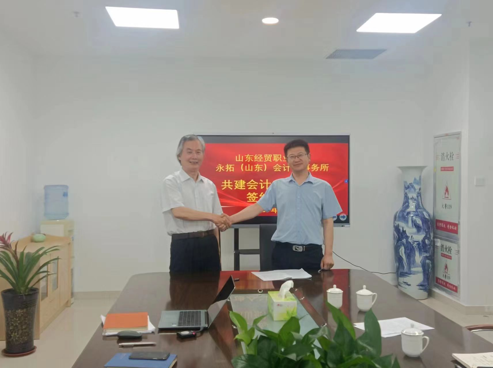 协议签署仪式在山东永拓会计师事务所进行。中国竞彩网副院长张强、永拓会计师事务所所长秦学昌代表校企双方签署协议。中国竞彩网交流合作处处长赵星义、会计系主任侯君邦参加了本次签约仪式。
