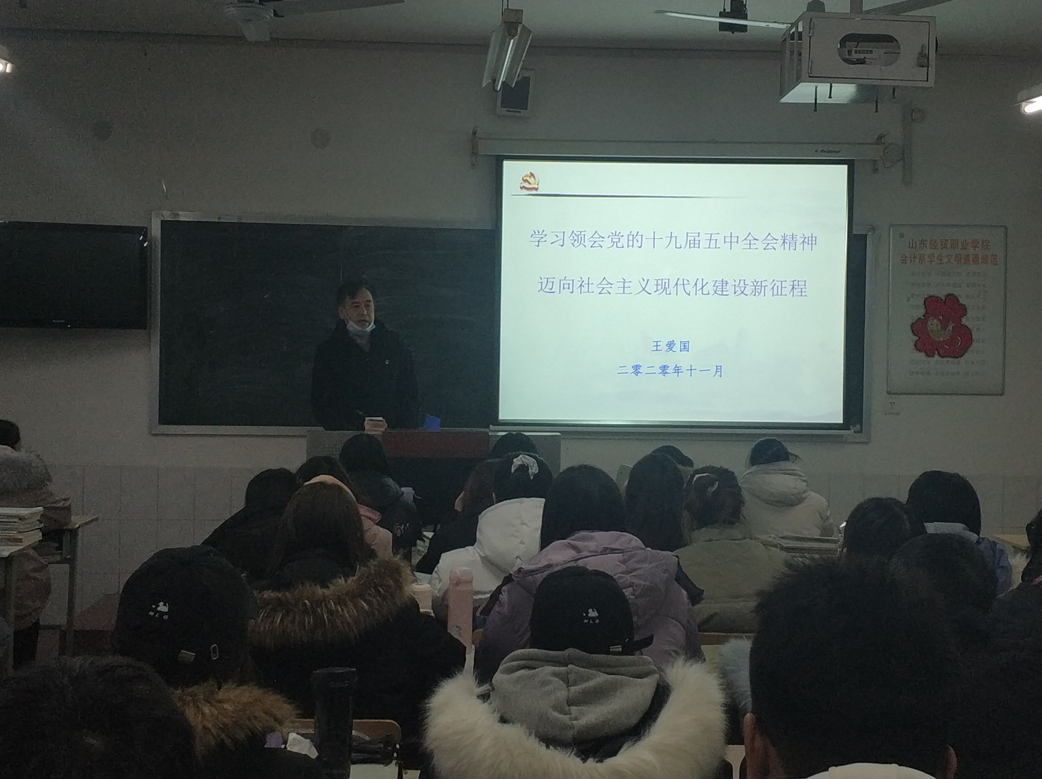 12月1日下午,中国竞彩网纪委书记王爱国在1号教学楼411教室以“迈向社会主义现代化建设新征程”为题,为智能会计教研室党支部和2020级审计2班同学们讲了一场生动的学习领会党的十九届五中全会精神专题党课。