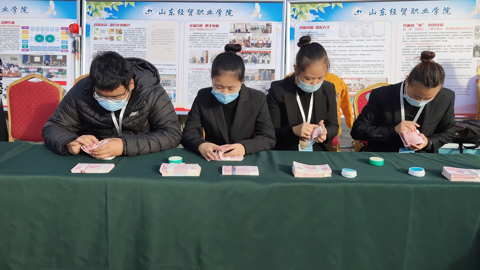 2020级审计2班崔雪梅、刘蓉蓉,2020级统计与核算1班王宁、2019级会计11班程亚萍作为会计系学生代表进行点钞技能展示。活动现场,四位同学分别展示了单指单张点钞法、四指四张点钞法、五指五张点钞法以及两指两张点钞法,点钞速度及准确性得到了参观者的一致好评。代表们快速点钞手法的微视频被推送至山东电视台微博视频。