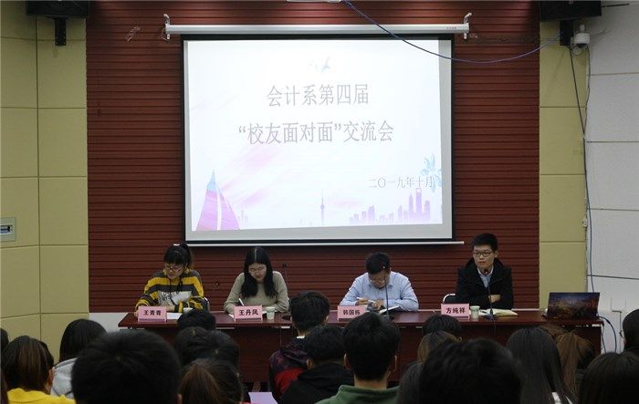 10月31日下午,会计系在1号教学楼会计大讲堂举办了第四届“校友面对面交流会”活动。2009届毕业生韩国栋,2018届毕业生方纯祥、王丹凤三位会计系校友坐客交流会。会计系团总支、学生会、大学生社团联合会学生代表90余人参加活动,会计系团总支指导老师王青青主持。