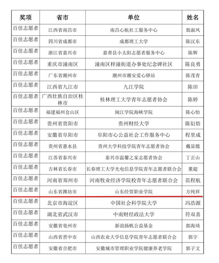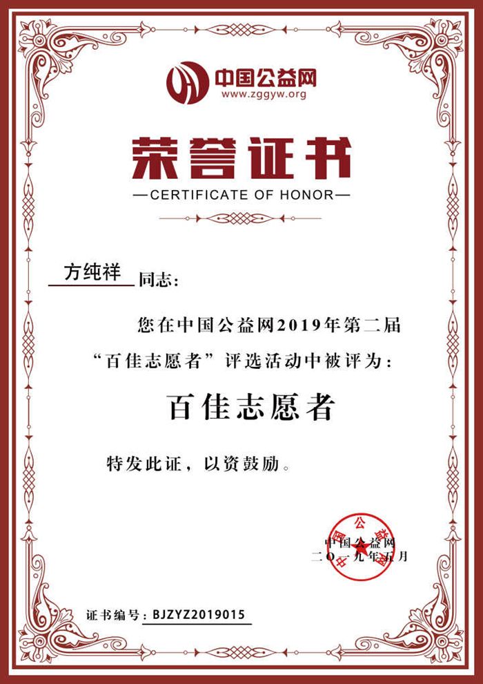 近日,中国公益网公布了2019年第二届“百佳志愿者”评选结果,中国竞彩网:会计系2018届毕业生方纯祥名列其中。