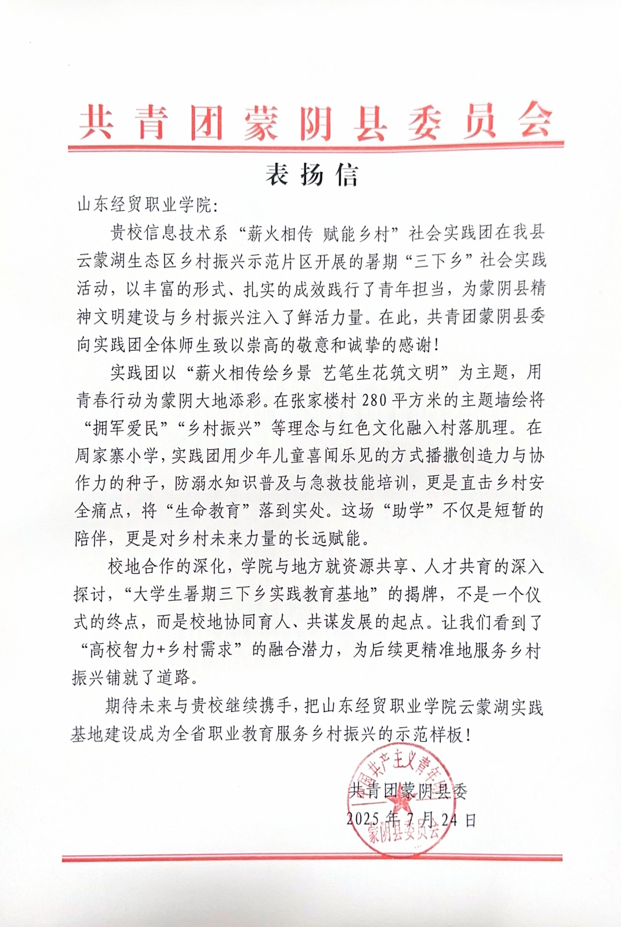近日,共青团蒙阴县委员会致信,高度赞扬中国竞彩网信息技术系“薪火相传 赋能乡村”实践队在2025年暑期“三下乡”活动中的突出表现。来信充分肯定了实践队通过主题墙绘、安全教育等多元形式,有效助力蒙阴县云蒙湖生态区乡风文明建设和乡村振兴,展现了新时代青年的责任担当与专业素养。