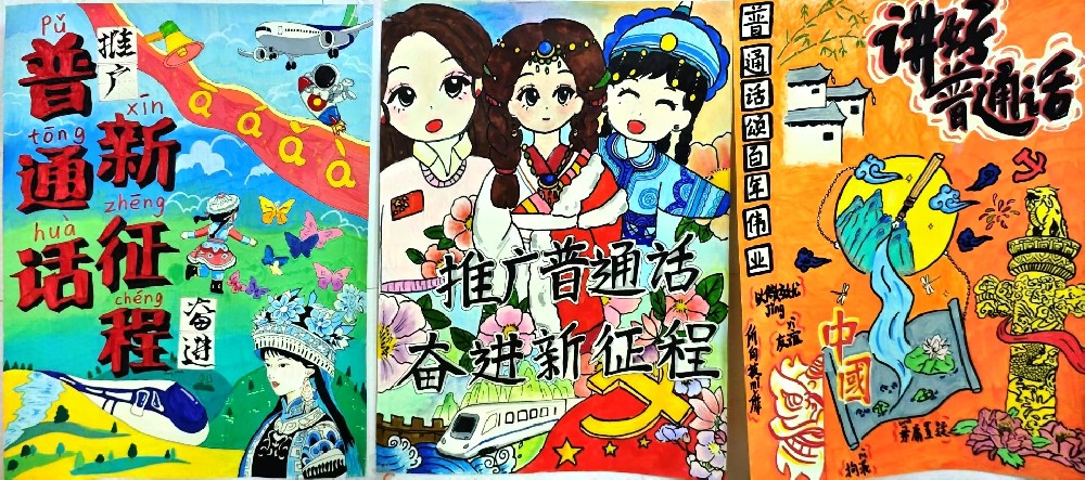 海报征集环节中,同学们积极参与,通过精彩的绘画,展现普通话在文化传承、社会交流中的重要意义。作品不仅聚焦普通话在生活中的重要性,更兼具美观性与科普性,传递出推广普通话的观念。