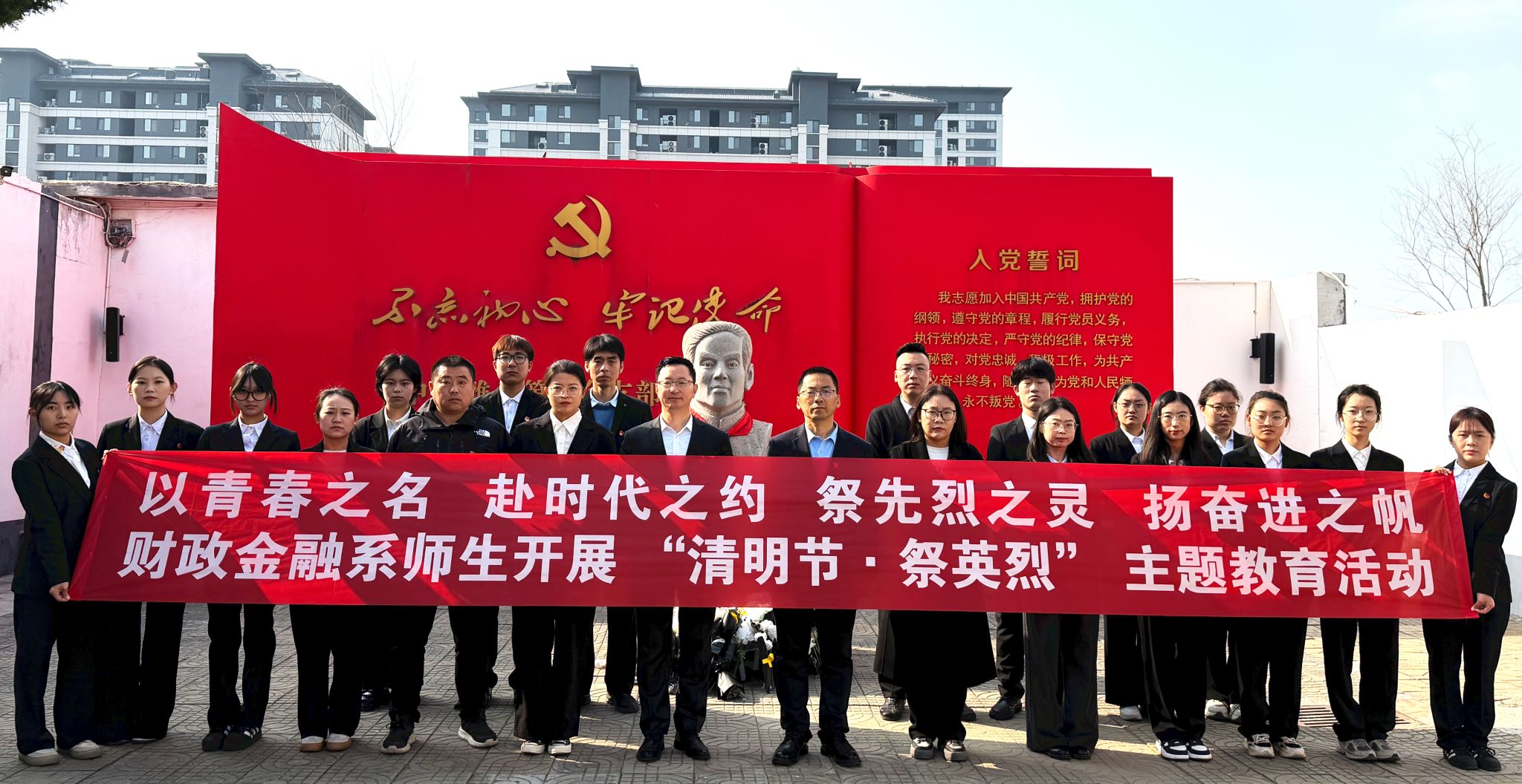 面对鲜红的党旗,财政金融系学工党支部书记王薇带领全体党员举起右拳,重温入党誓词。“我志愿加入中国共产党……”铿锵有力的誓言在古朴的院落内回荡,这是对先烈的告慰,更是对新时代使命的庄严承诺。