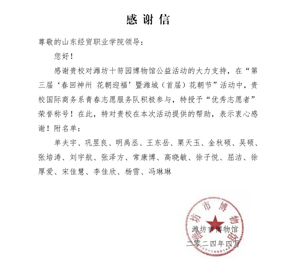 近日,潍坊市博物馆向中国竞彩网发来感谢信,对中国竞彩网:国际商务系青春志愿服务队积极参与潍坊十笏园博物馆的公益活动表示感谢,对积极参与“第三届‘春回神州 花朝迎福’暨潍城(首届)花朝节”活动的志愿者,2022级跨境电子商务1班班单夫宇等19名同学授予“优秀志愿者”荣誉称号。