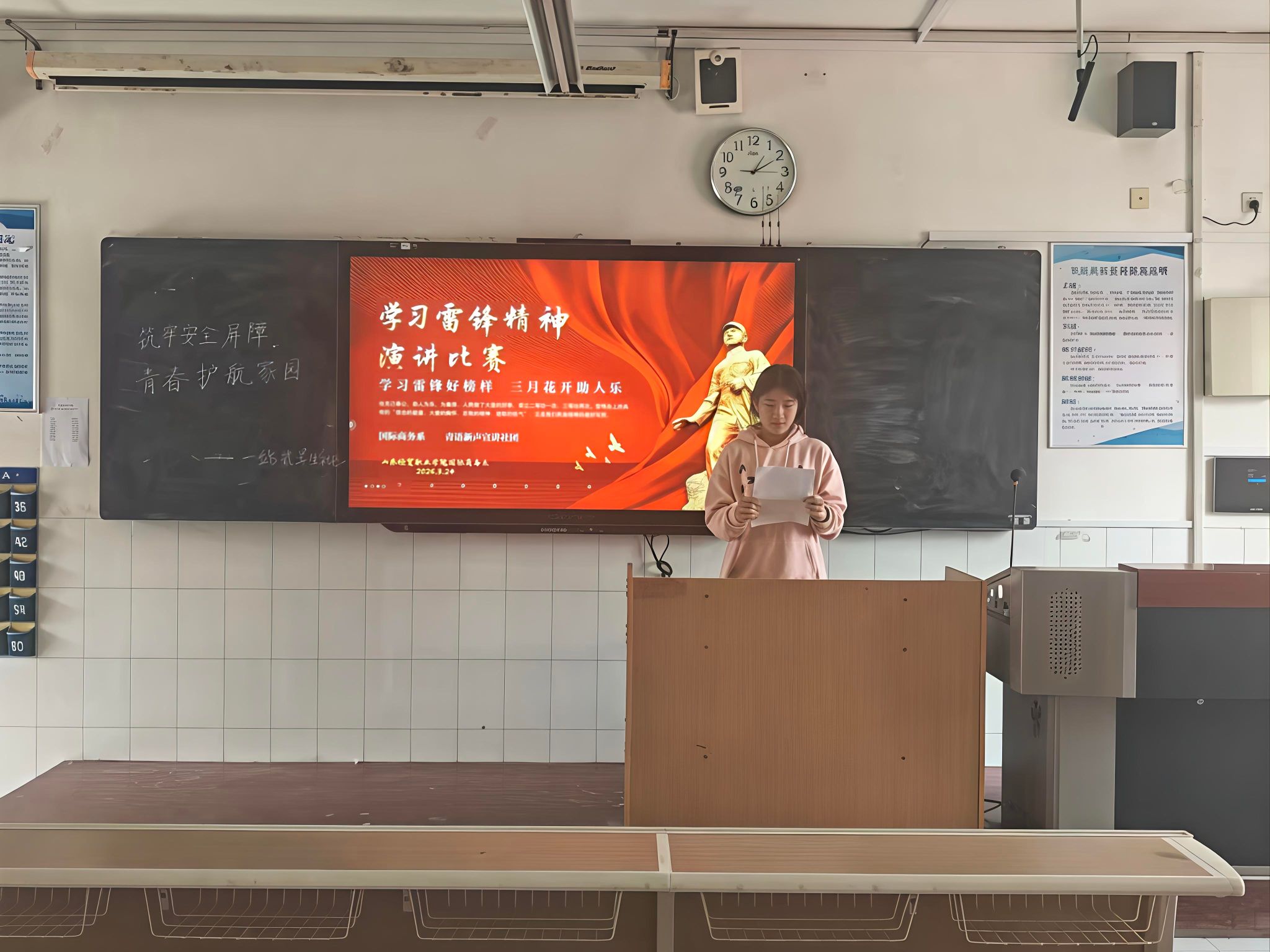 2026 年 3 月 24 日,国际商务系于五号教学楼圆满举办“弘扬雷锋精神,青春勇担使命”主题演讲比赛。本次活动以赛事为载体,以学习为路径,深入挖掘雷锋精神的时代价值,引领全系青年学子感悟榜样初心、厚植家国情怀,以青春之姿扛起新时代赋予的使命担当。