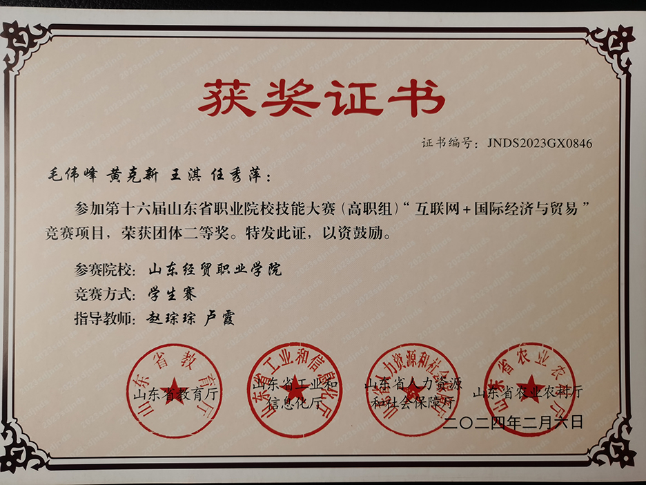 第二届山东省跨境电子商务大赛中荣获高校赛道团体二等奖