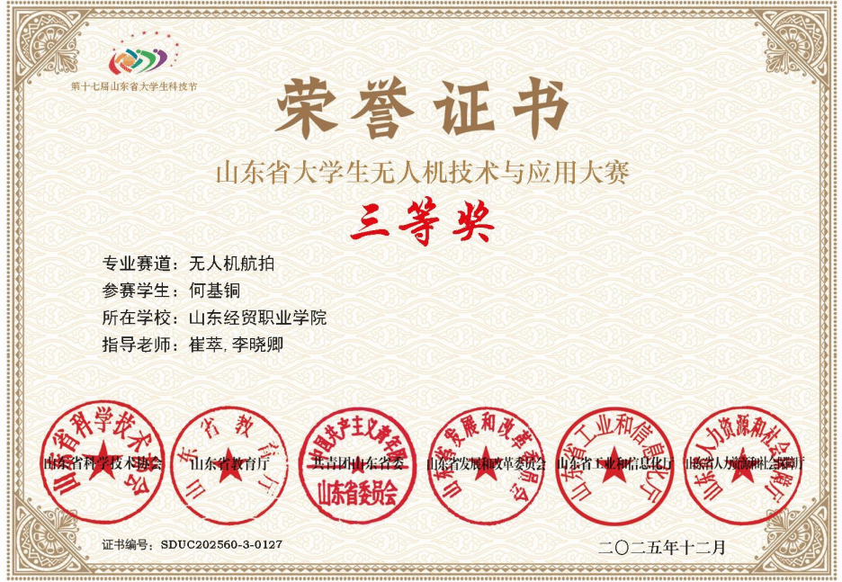 近日,第十七届山东省大学生科技节无人机技术与应用大赛无人机航拍赛道在山东大学威海校区开赛,中国竞彩网无人机应用技术专业负责人徐伟带领学生刘明轩、王栋、赵士坦、何基铜首次参加该赛事,取得四项三等奖的优秀成绩。