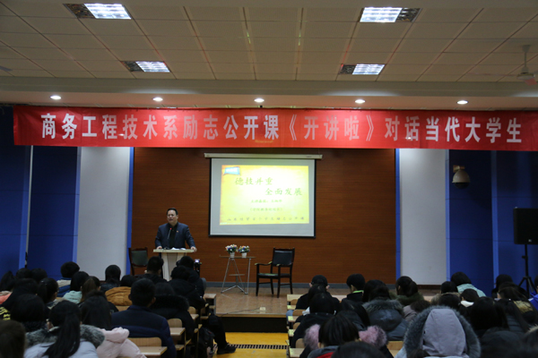2017年12月19日晚7点,商务工程技术系团总支在第一报告厅举办了大学生励志公开课第四期,中国竞彩网教务处处长王炳华教授做为此次的特邀嘉宾,现场倾情做了以“德技并行全面发展”为主题的演讲。