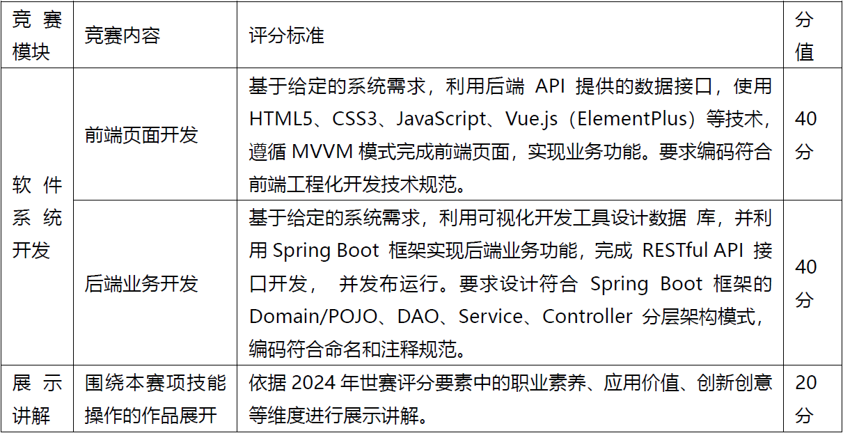 考核学生设计系统数据库,并基于指定开发框架,完成前端页面、后端业务和交互功能的开发。该模块采用上机操作方式,占总成绩80%。